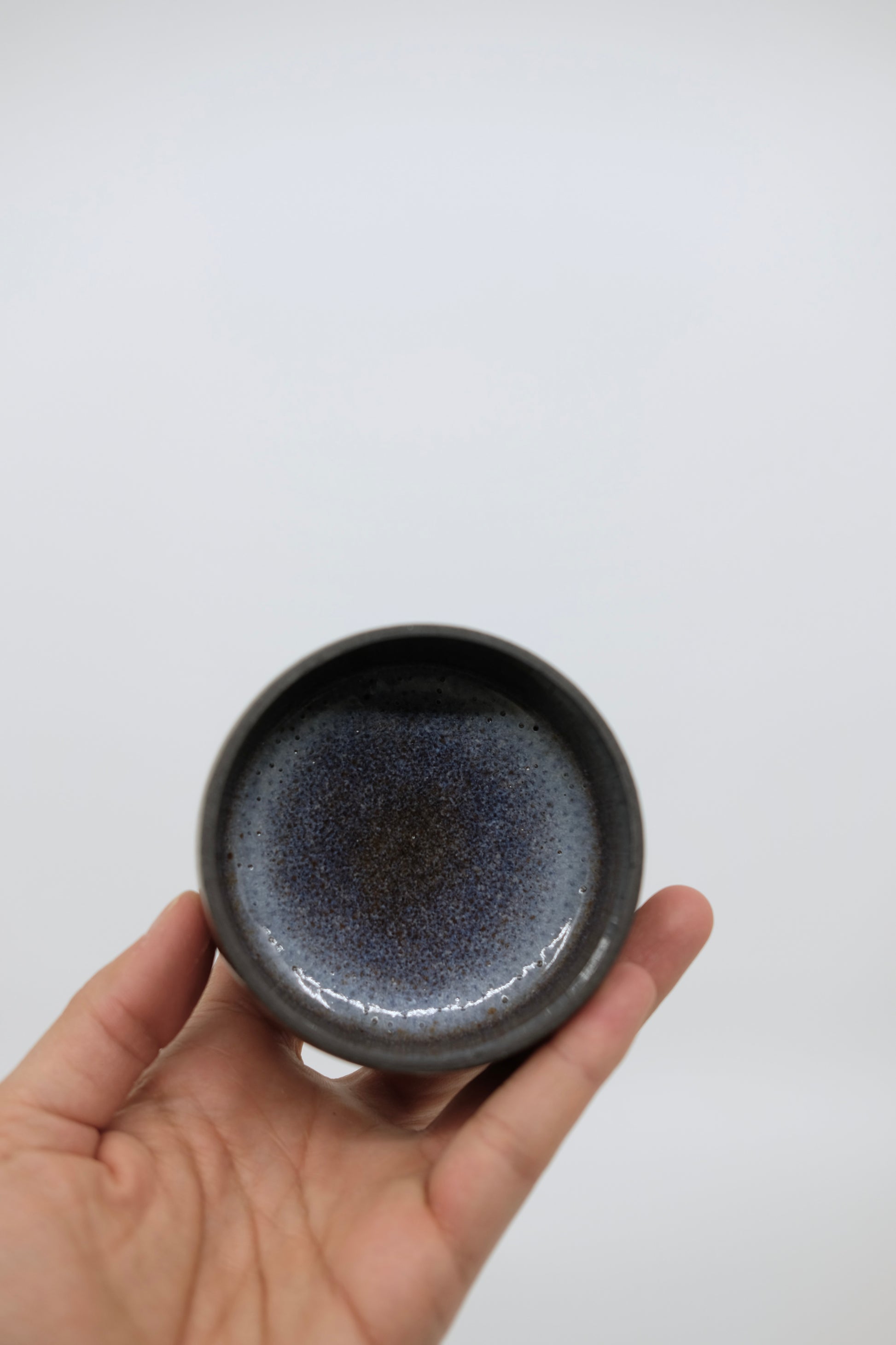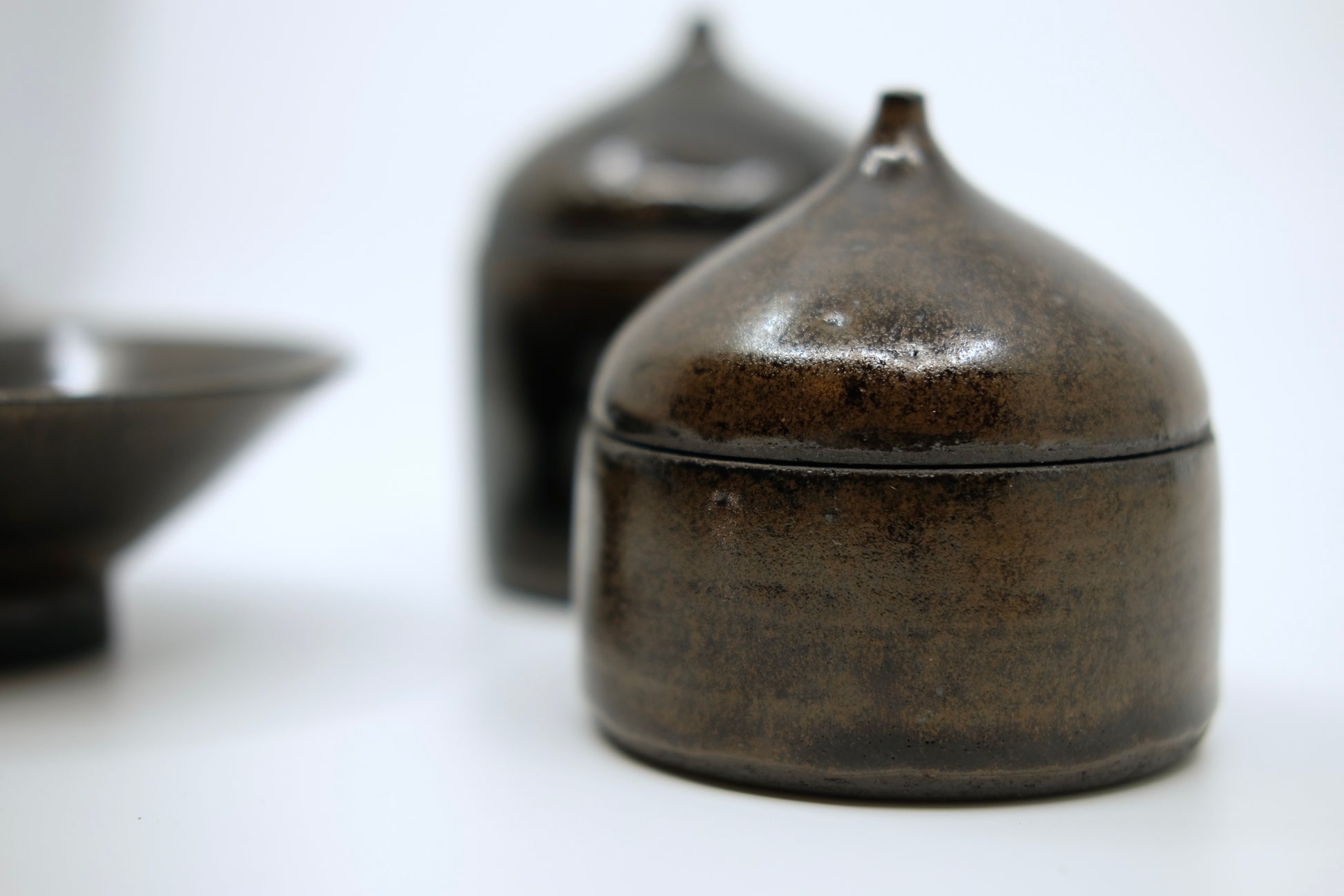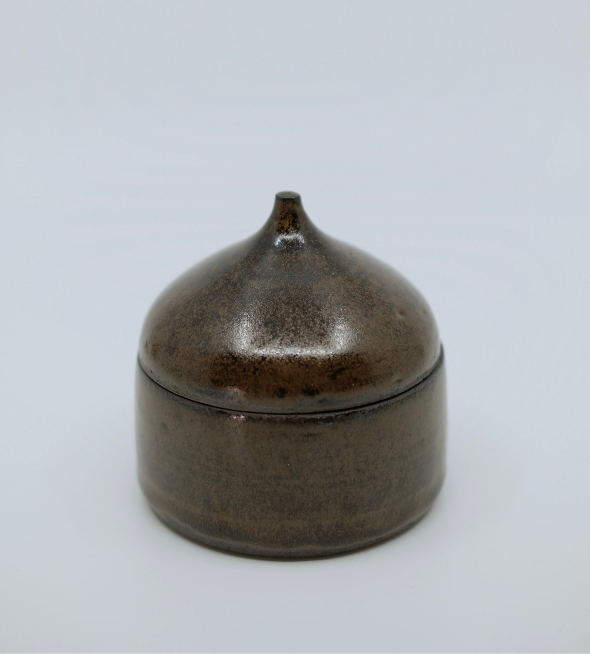 Die Dose aus schwarzem Ton ist mit einer Tenmoku-Glasur überzogen. Je nach Lichteinfall erscheint die Dose schwarz oder dunkelbraun. Innen erwartet dich eine kleine Glasur-Überraschung.