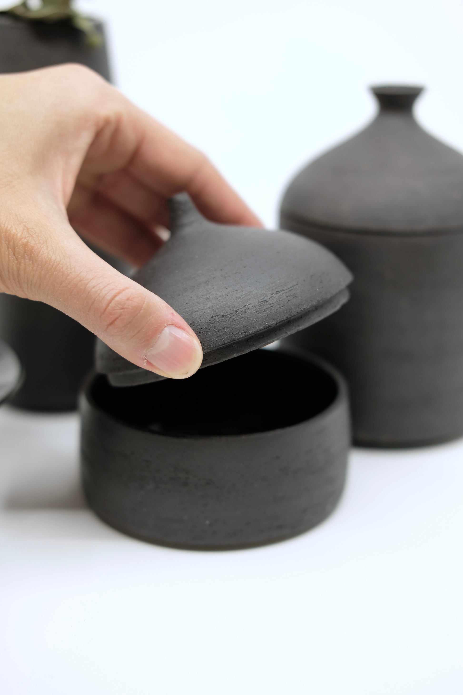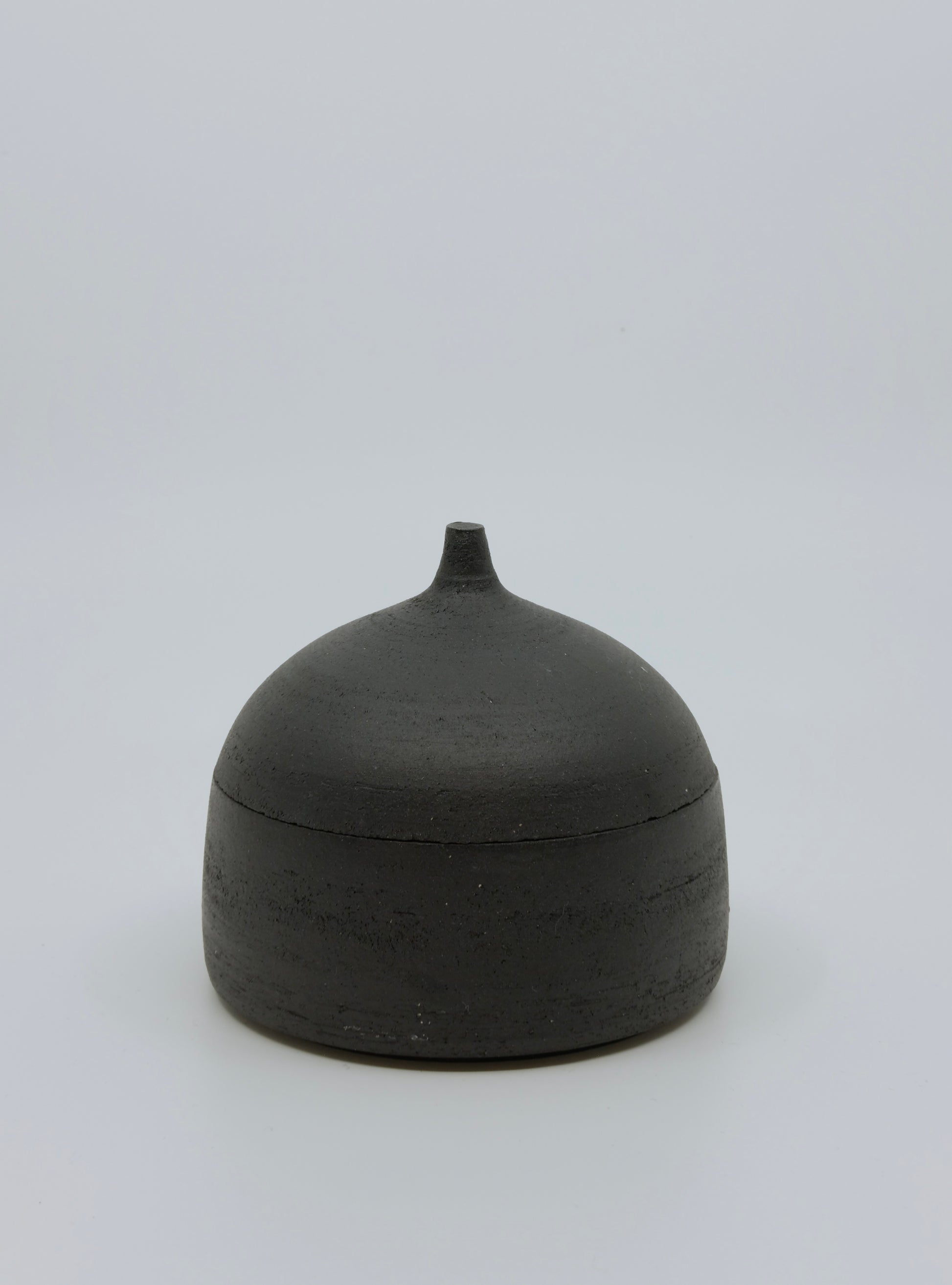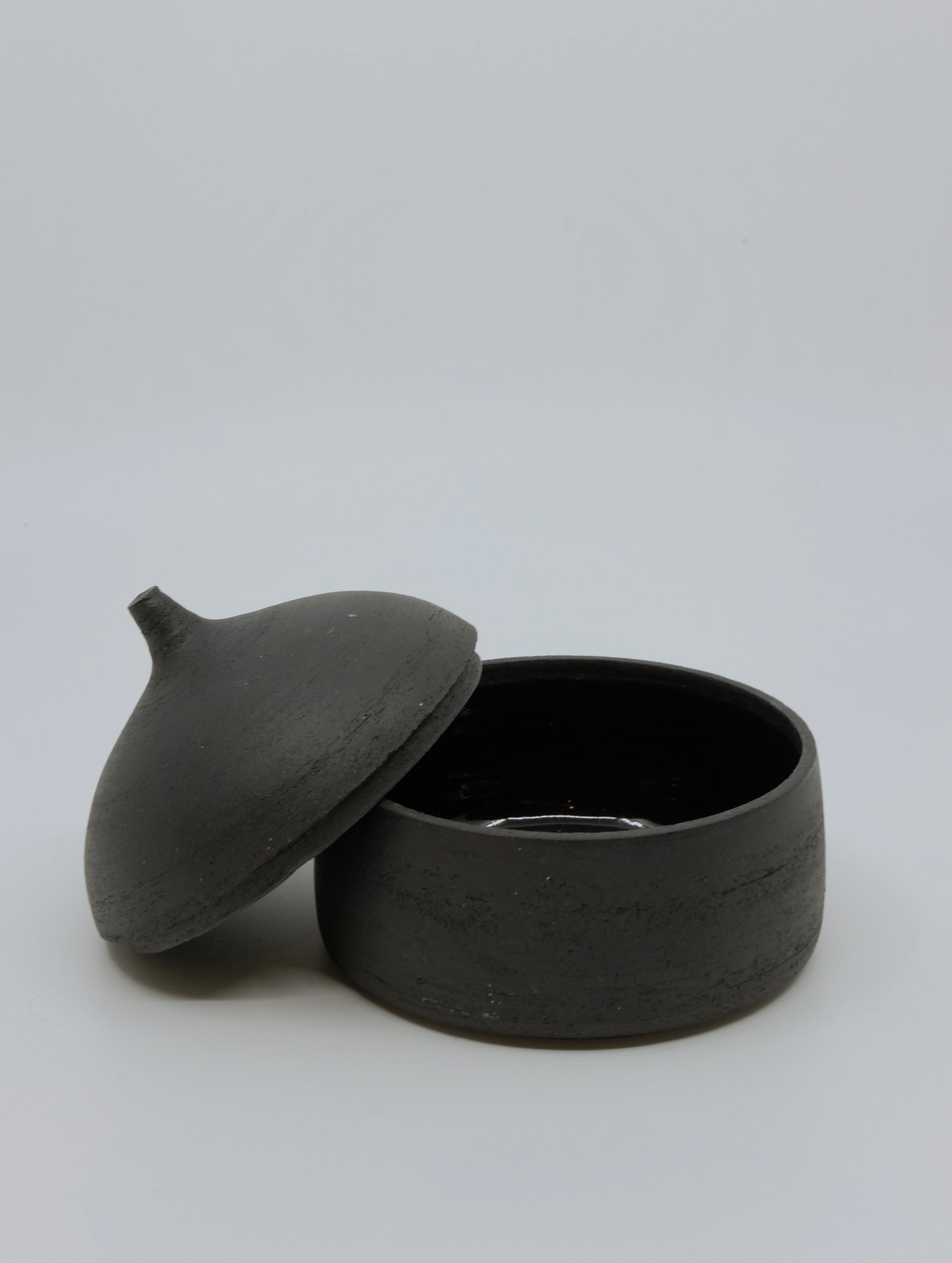 Mattschwarze, aussen unglasierte Dose (innen glasiert) zur Aufbewahrung von Gewürzen oder Schmuck.
