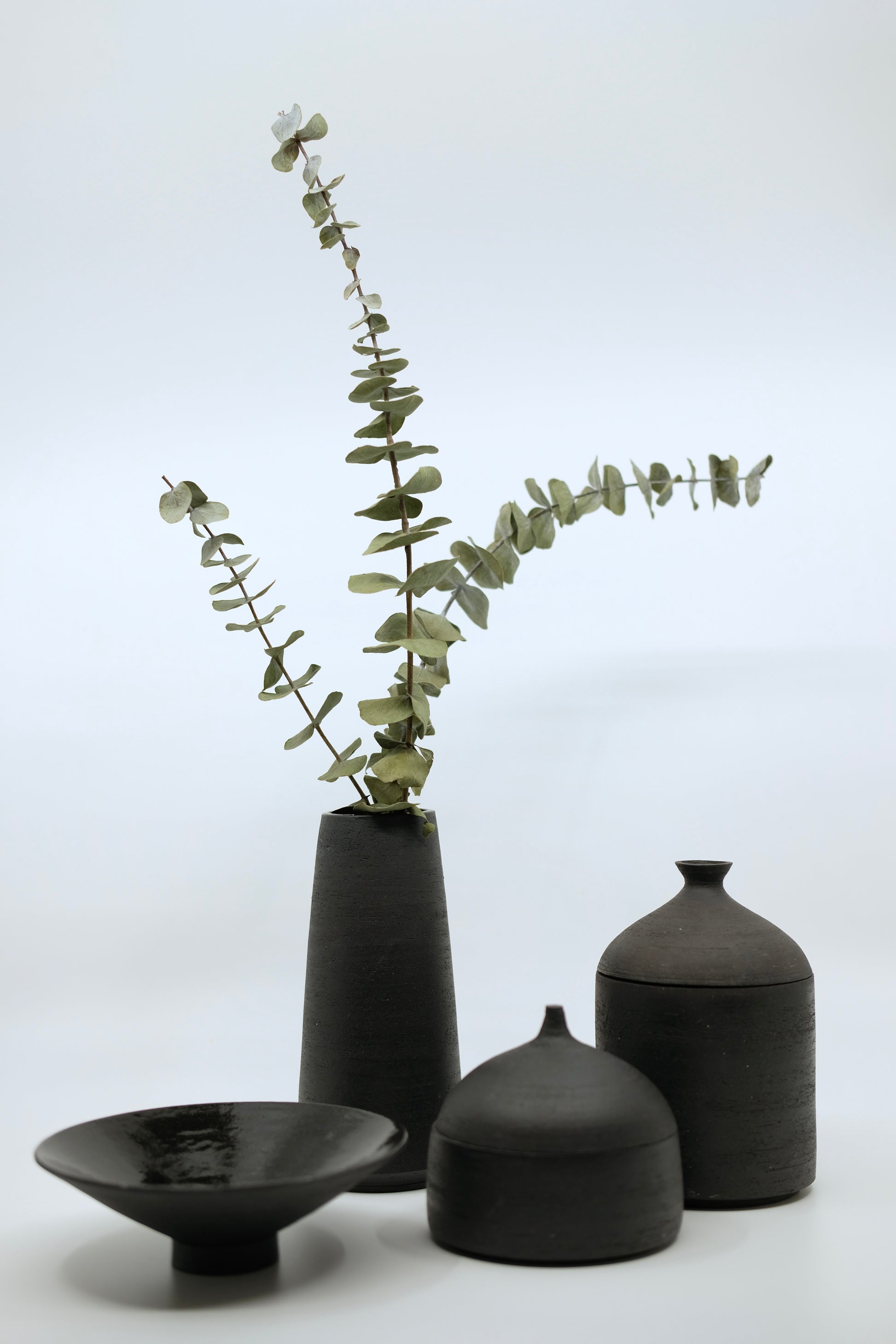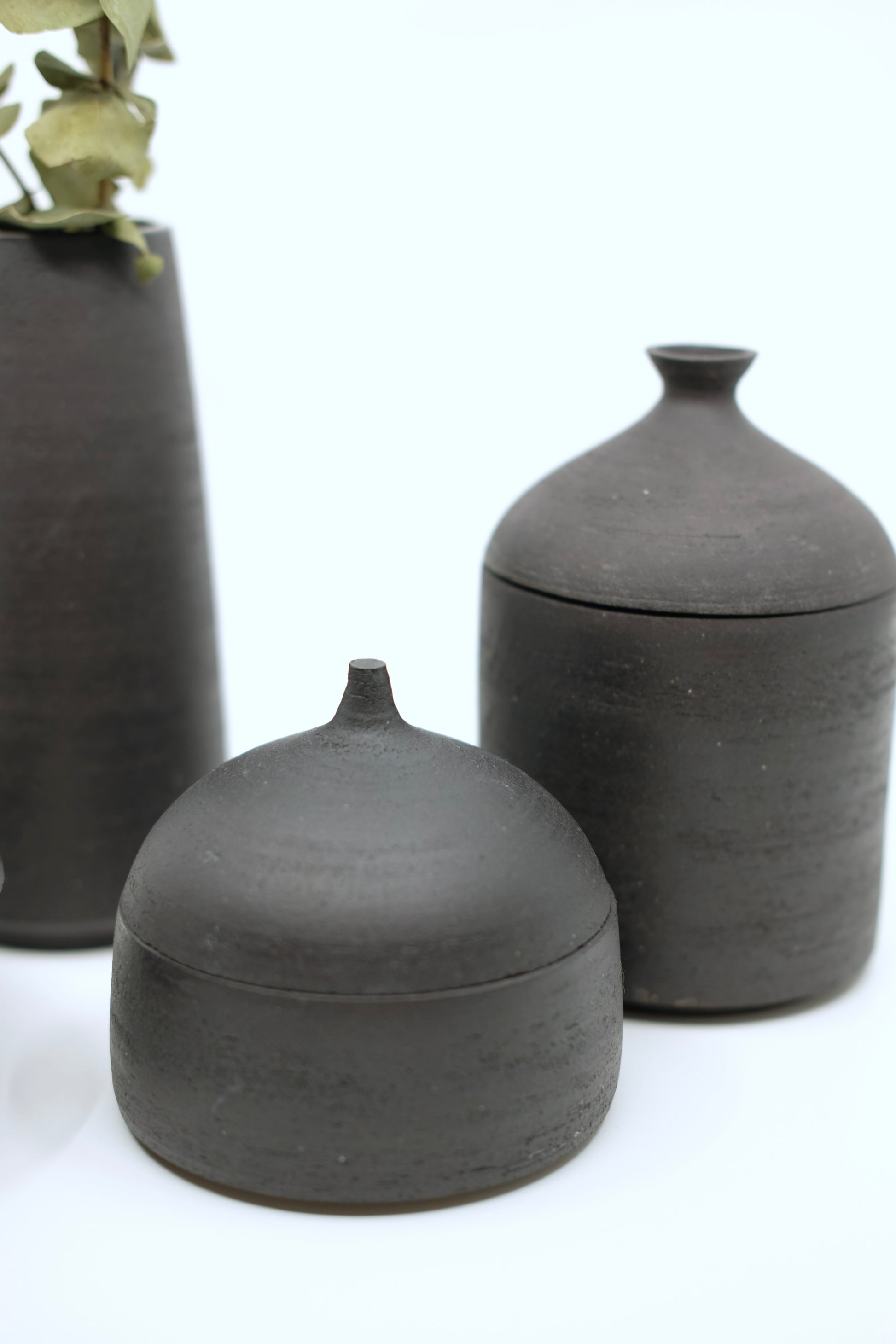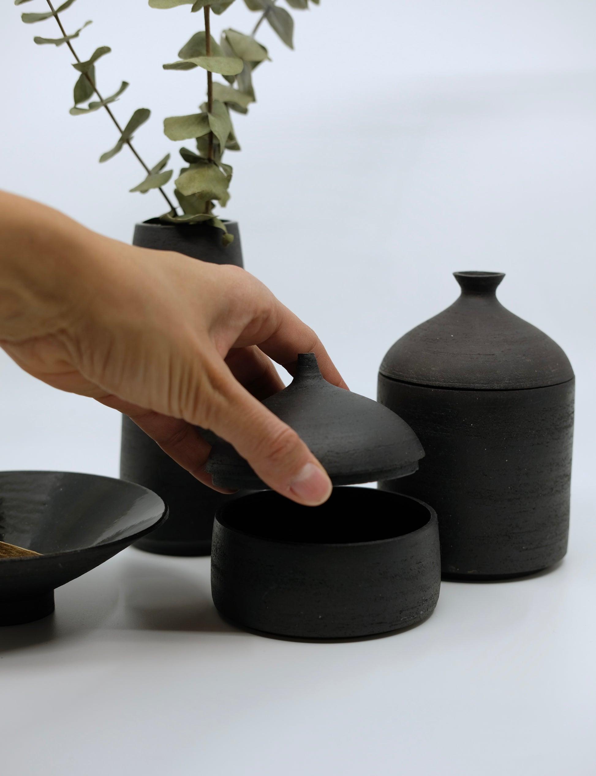 Mattschwarze, aussen unglasierte Dose (innen glasiert) zur Aufbewahrung von Gewürzen oder Schmuck.