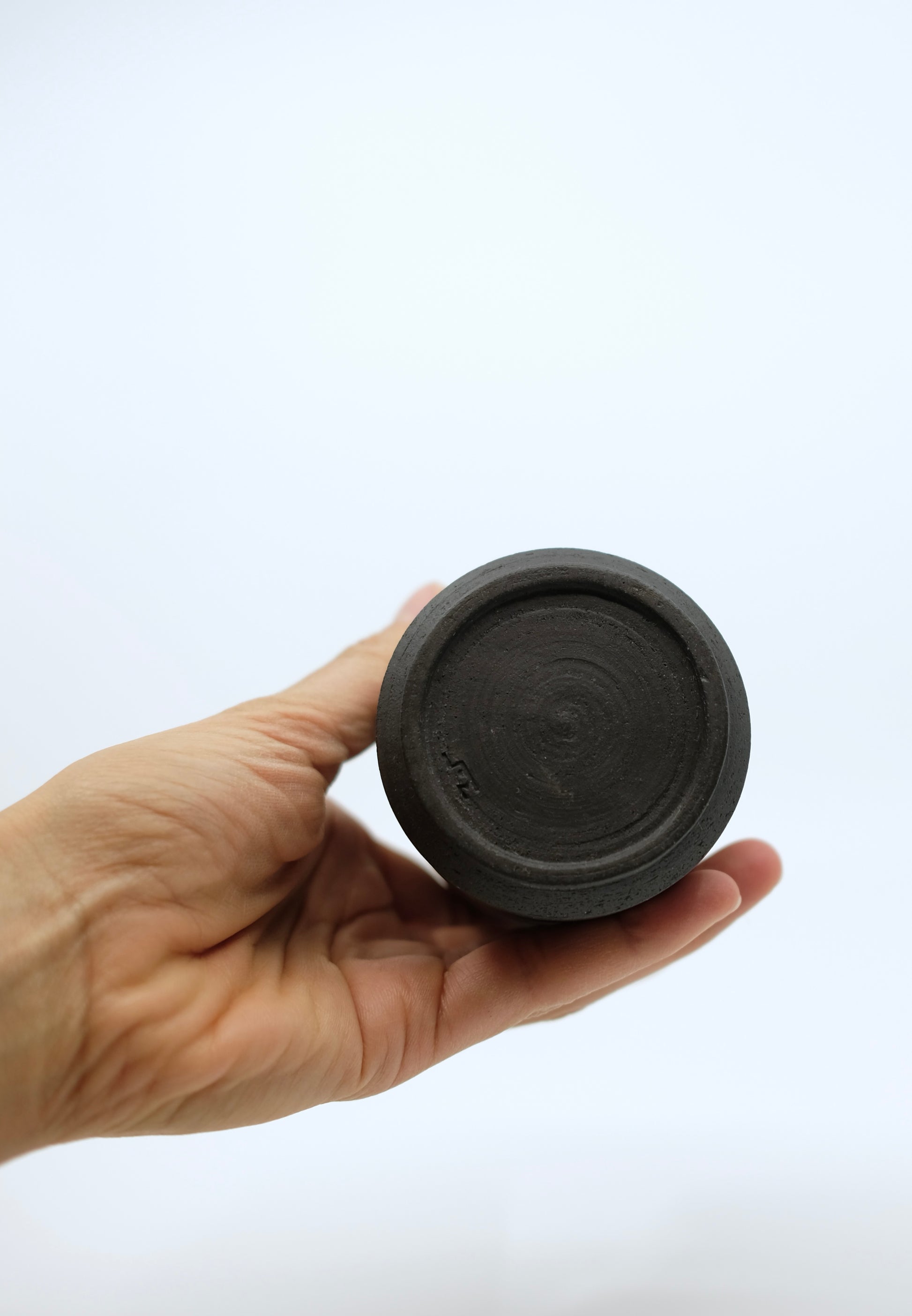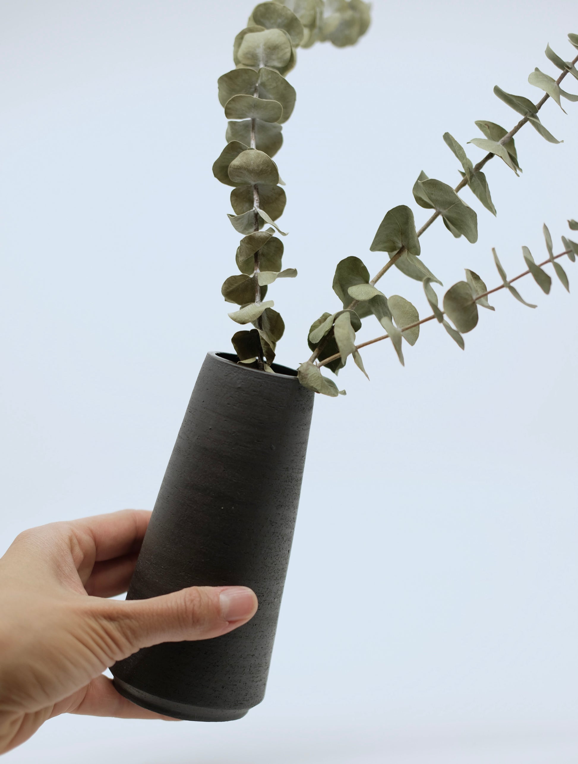 Minimalistische Konische Vase aus mattschwarzem Ton. Aussen naturbelassen, innen glasiert. In der Schweiz hergestellt und spülmaschinenfest.