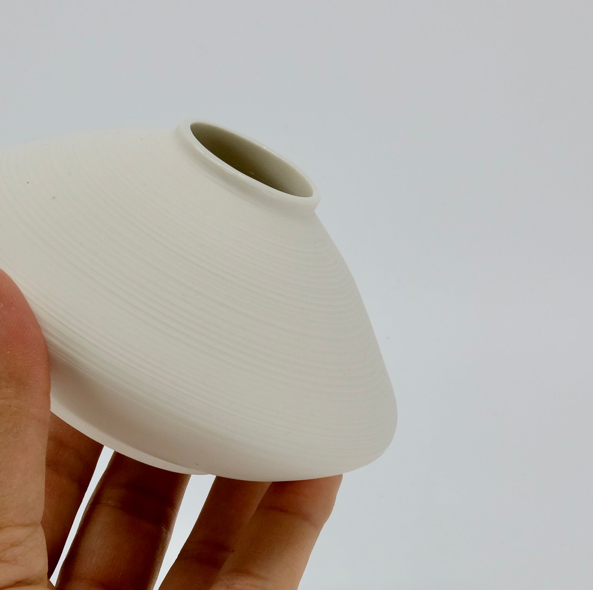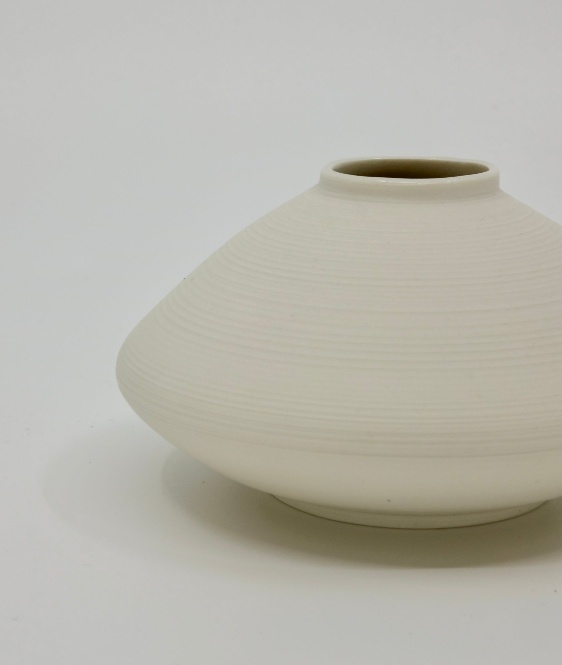 Die aussen unglasierte Vase aus Porzellan, inszeniert man am besten mit kleinen Schnitt- / Trockenblumen oder man kombiniert sie mit anderen formschönen Vasen. Ihre gerippte Oberfläche macht sie zum haptischen Highlight.